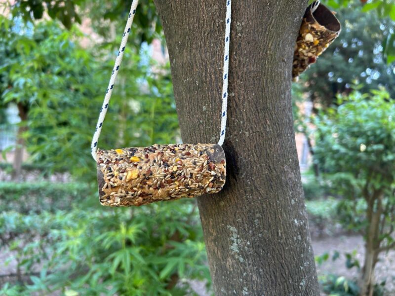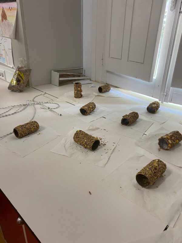 The project consists of a bird feeder, made with toilet paper roll tube, birdseed, peanut butter and a rope. The goal was that the birds ate this food that was hung for the trees around the fountain of the Maria virgin. The sense of the activity is that we should care about the things that we normally have everyday, not to destroy or kill them, for example the animals like the birds or the plants; but care for them.